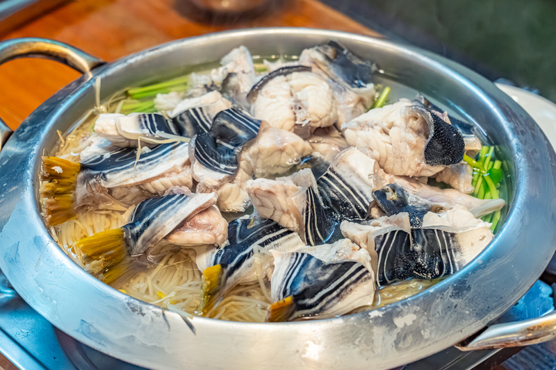 Sides for sliced raw fish is a dining style where customers buy freshly sliced raw fish from the market and pay only a table service fee. The restaurant provides plates along with red chili paste with vinegar, leafy vegetables for wraps, garlic, and red chili peppers. They can also order spicy fish stew using leftover parts such as fish heads and bones provided by the fish vendor. This practice originates from traditional fish markets, and today, specialized table service restaurants often lease space in the market so customers can eat their sliced raw fish immediately on-site.